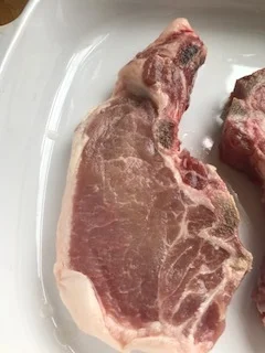 Our pork chops tend to be lean and very meaty. This is because of how we raise them outdoors with lots of exercise. Why would you want fatty meat? I know chefs and culinary experts say that fat is where the taste is BUT on meat that isn't always true. Well raised meats like our pork and beef has the flavor in the meat, fat would add some more moisture to the meat but it's difficult to do when your animal is so active.